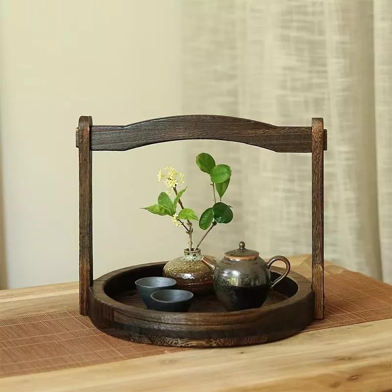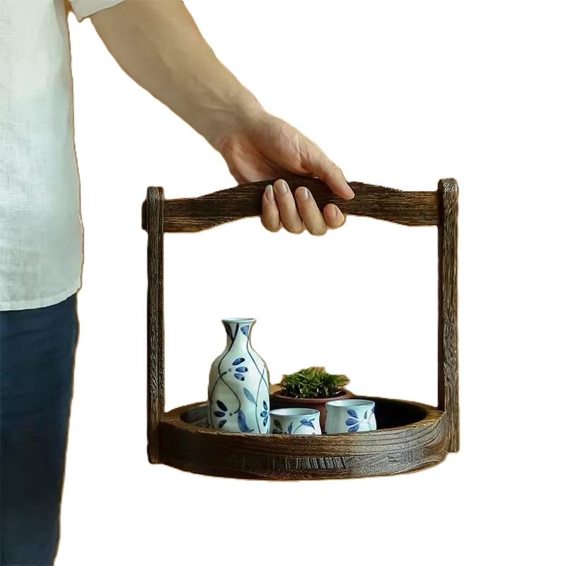 ถาดชาไม้มะม่วงทรงกลมทำด้วยมือแบบย้อนยุคถาดเสิร์ฟแบบพกพาสำหรับบ้านห้องครัวคาเฟ่