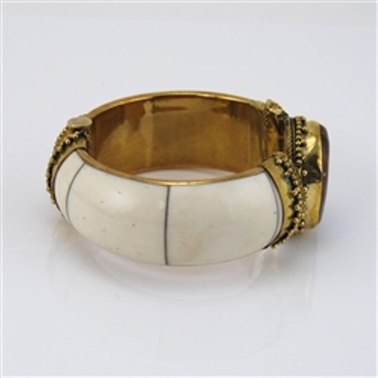 กำไลข้อมือทำมือจากกระดูกควายและทองเหลือง ประดับด้วยหินรูปไข่สีดำตรงกลาง สไตล์วินเทจ แบบมีบานพับ สำหรับผู้หญิง
