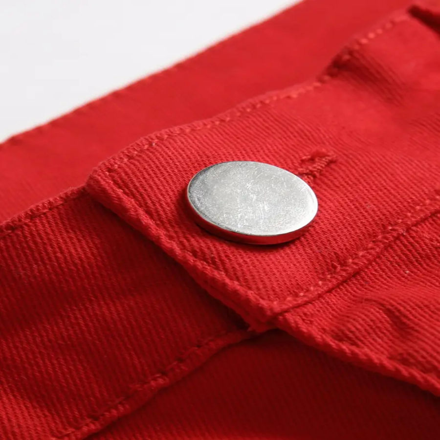 100% กางเกงขาสั้นผ้ายีนส์สีแดงยืดได้สำหรับผู้ชายขาตรงมาใหม่ผลิตตามสั่งแบบ2025