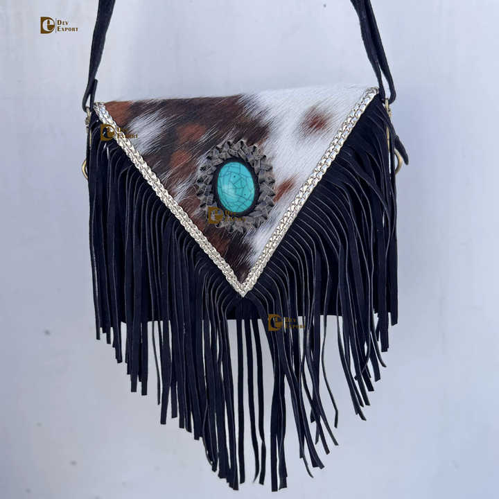 กระเป๋าสะพายข้างหนังวัวแท้ประดับพู่หนัง รุ่นใหม่ล่าสุด ปี 2026 สไตล์โบฮีเมียน ประดับด้วยหินสีฟ้าคราม กระเป๋าถือสุดเก๋ ขายดี กระเป๋าใบเล็ก