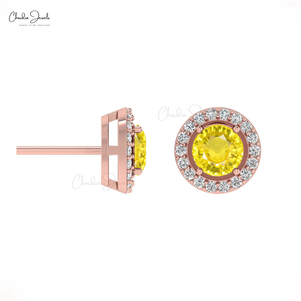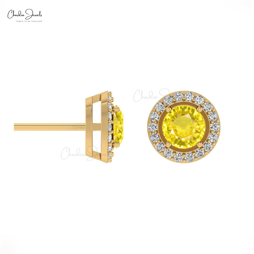 ต่างหูทรงกลมประดับพลอยแซฟไฟร์สีเหลืองขนาด 4 มม. ดีไซน์รัศมีประดับเพชรในทองคำ 14k งานละเอียด พร้อมจำหน่ายจากผู้ผลิตเครื่องประดับ