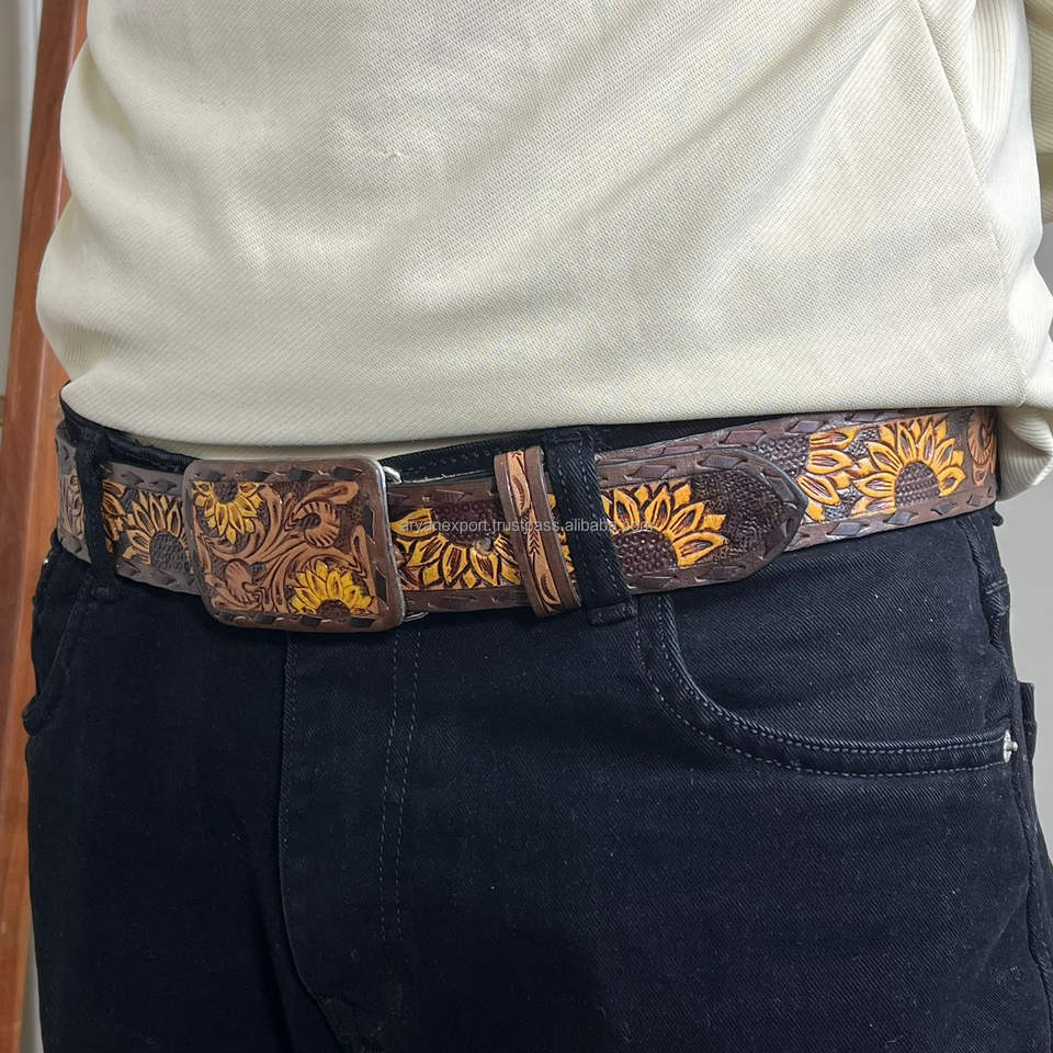 เข็มขัดหนังแท้ลายดอกทานตะวัน งานแฮนด์เมด หนังวัวแท้คุณภาพสูง หัวเข็มขัดถอดได้ สำหรับผู้ชายและผู้หญิง สินค้ามาใหม่