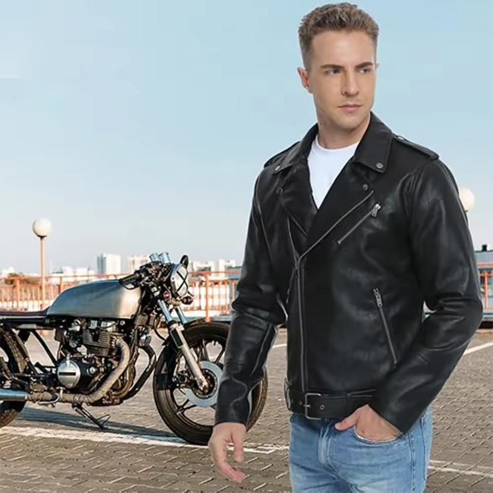 แจ็คเก็ตหนังสีดำสำหรับผู้ชายรุ่นใหม่ล่าสุด – สไตล์มอเตอร์ไซค์วินเทจ หนังแท้ ขายส่งจากโรงงานโดยตรง รับทำโลโก้ OEM