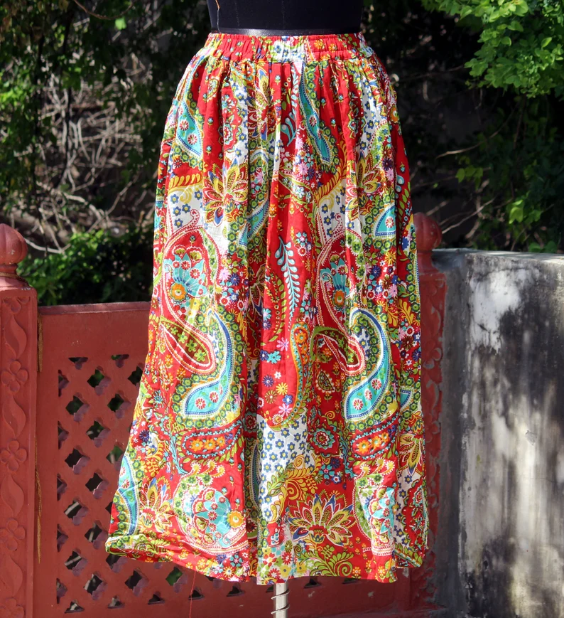 กระโปรงยาวสไตล์โบฮีเมียนของผู้หญิงผ้าเดนิมผ้าฝ้ายพิมพ์ลายทิวทัศน์ชายหาดผ้าเดนิมเนื้อผ้าระบายอากาศได้ดีแบบดั้งเดิมสำหรับฤดูใบไม้ร่วง