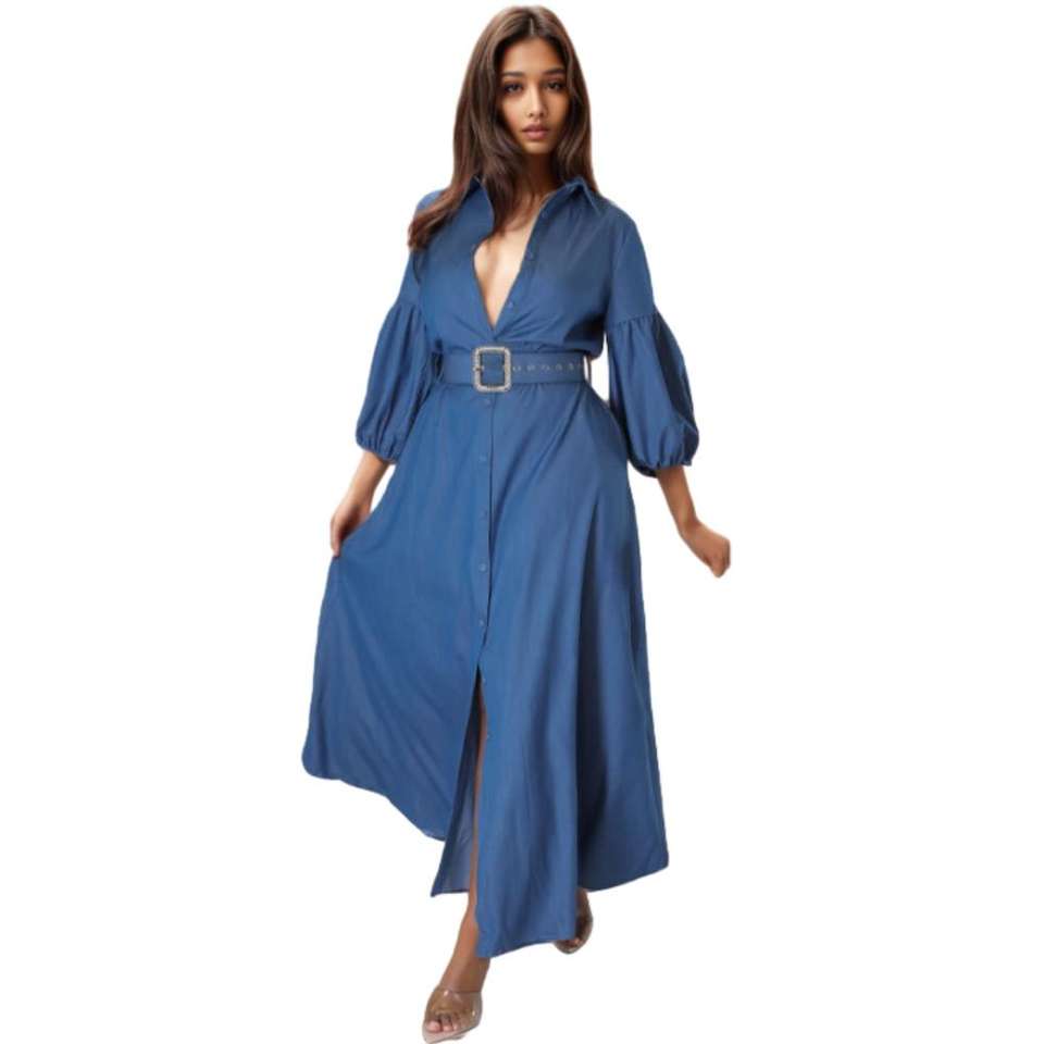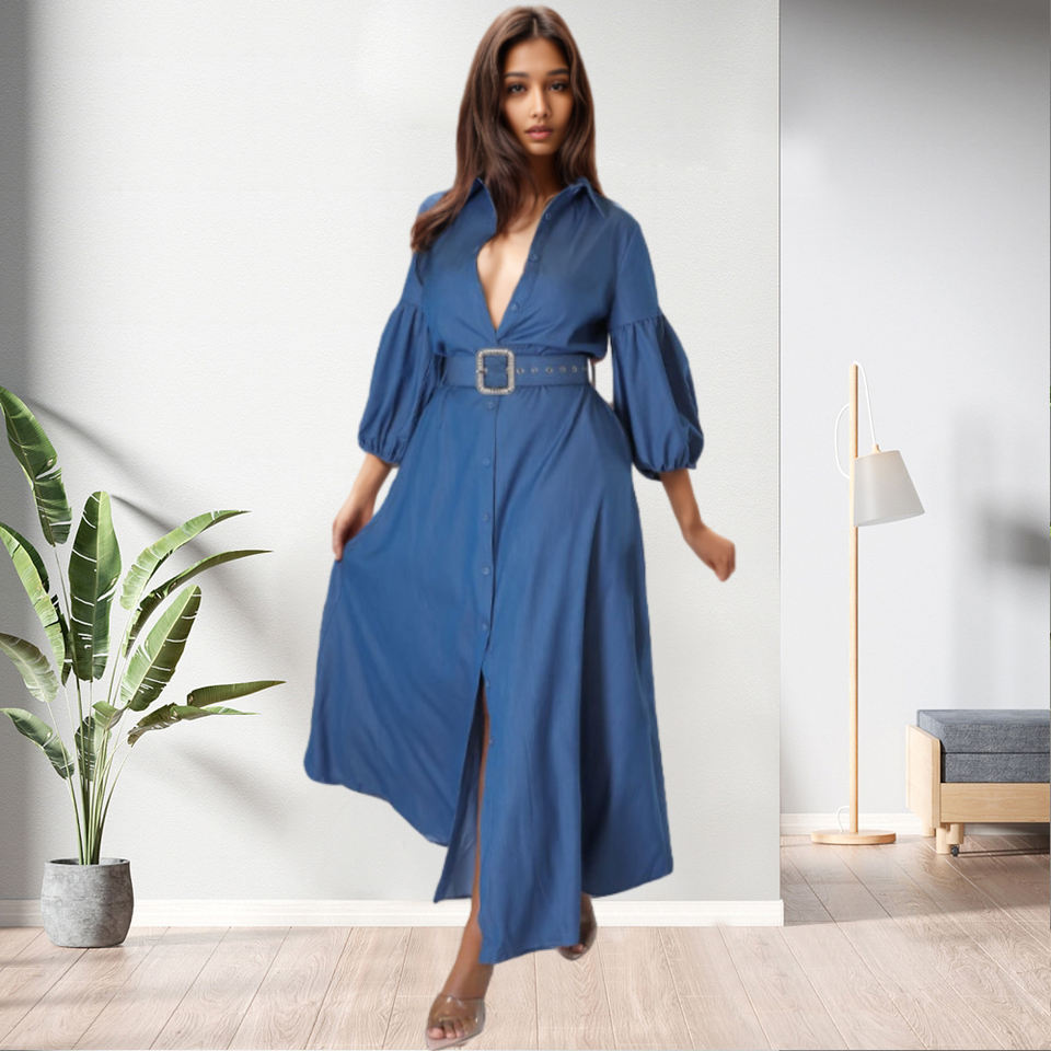 เดรสเสื้อยีนส์สีทึบสำหรับผู้หญิงมาใหม่ลำลองพร้อมเข็มขัดแฟชั่น