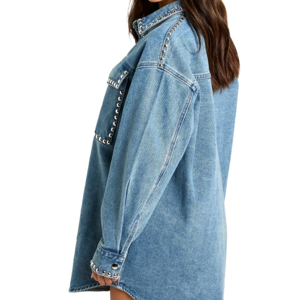 เดรสยีนส์สไตล์คาวบอยลำลองสำหรับผู้หญิง รุ่นใหม่ล่าสุด ทรงโอเวอร์ไซส์ ติดกระดุมด้านหน้า แขนยาว ประดับหมุด แต่งยีนส์สั้น