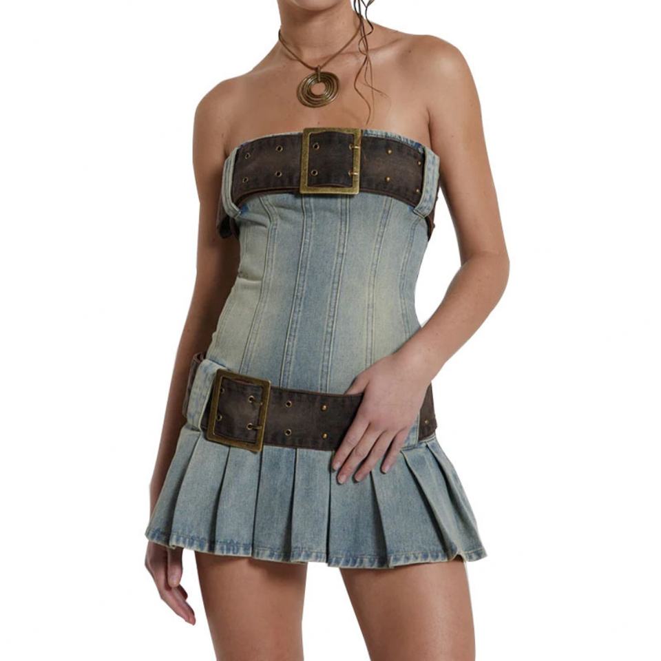 ชุดเดรสยีนส์สั้นทรงคอร์เซ็ทสีน้ำเงินแบบใหม่ล่าสุด ดีไซน์สไตล์คลับ แต่งเข็มขัด สำหรับผู้หญิง