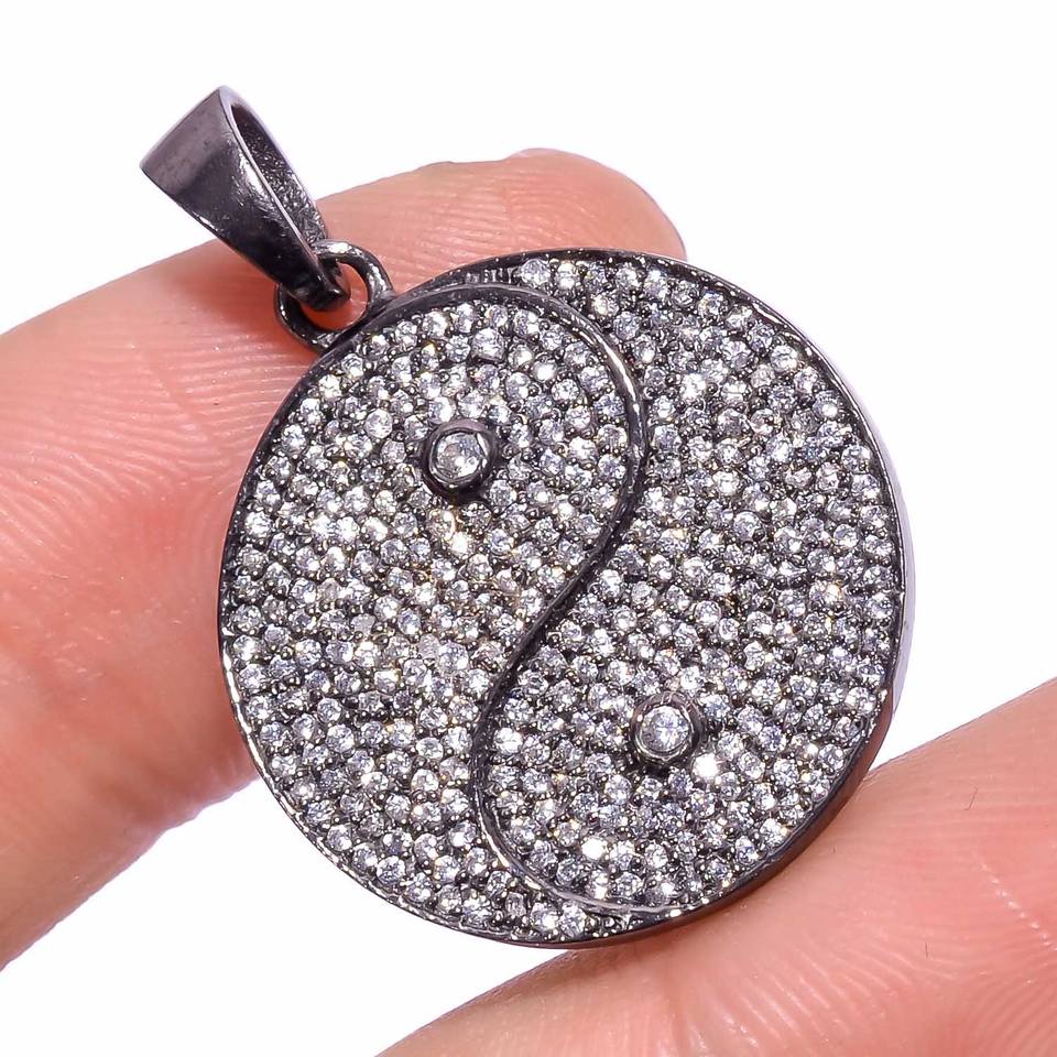 จี้หยินหยางประดับเพชรคิวบิกเซอร์โคเนียเคลือบโรเดียมสีดำ เครื่องประดับเสริมพลังจิตวิญญาณ ดีไซน์เรียบหรู ทำจากเงินแท้