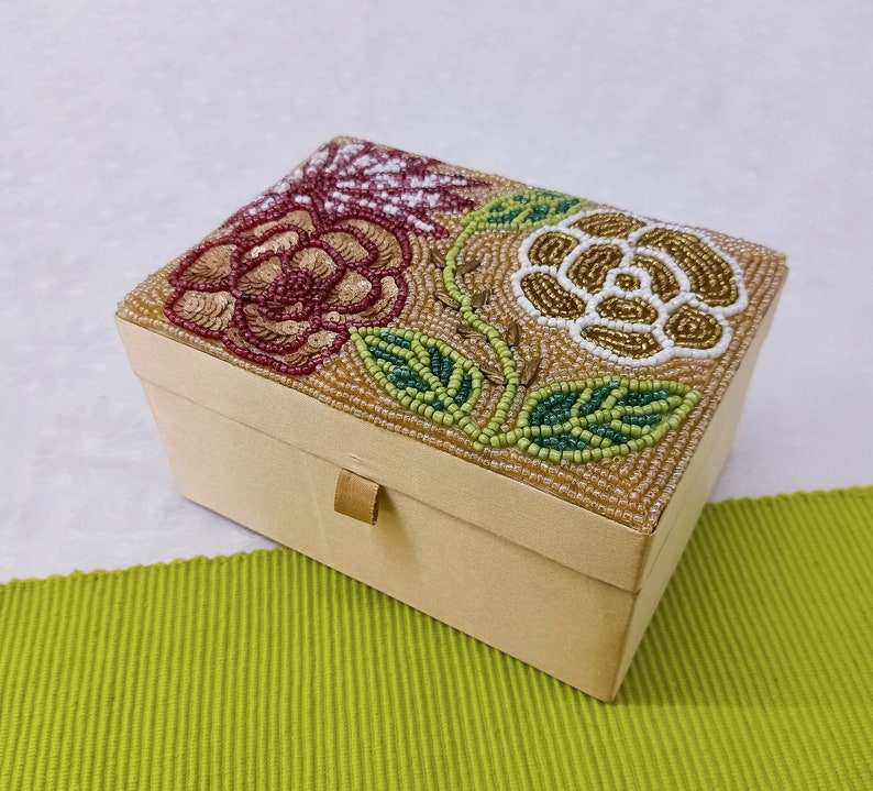 กล่องใส่เครื่องประดับสไตล์อินเดียแบบคลาสสิก งานปักลายดอกไม้สีเบจ วัสดุหนังกลับ สำหรับแหวนและต่างหู รุ่นใหม่ล่าสุด
