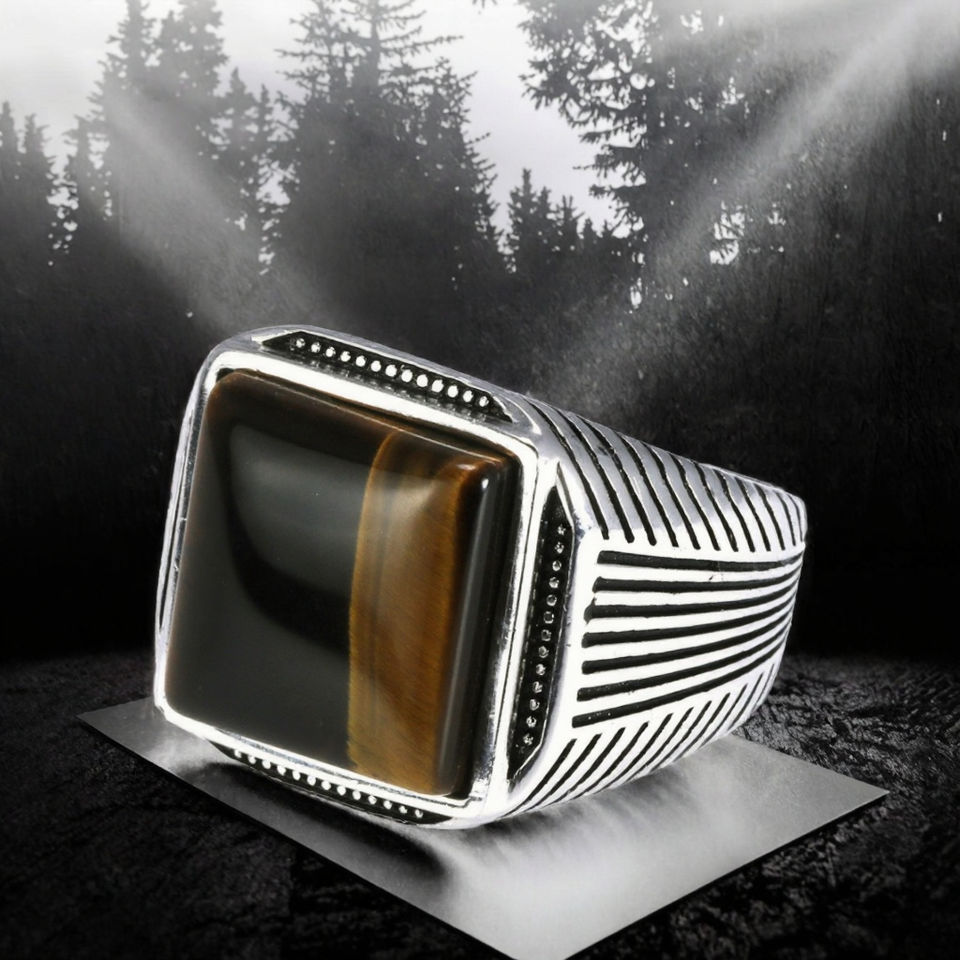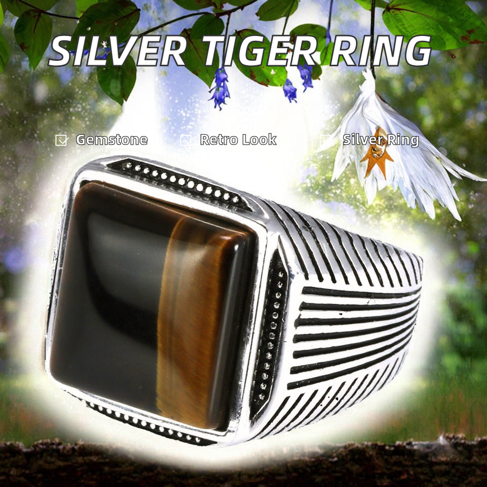 แหวนเงินแท้ 925 สไตล์เรโทรพังก์สำหรับผู้ชาย ลายเสือตาเสือ ชุบโรเดียม ประดับด้วยหินธรรมชาติ รุ่นใหม่ล่าสุด