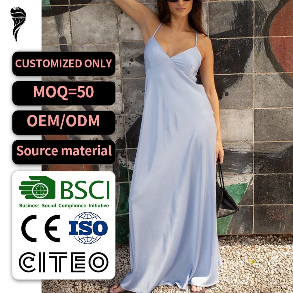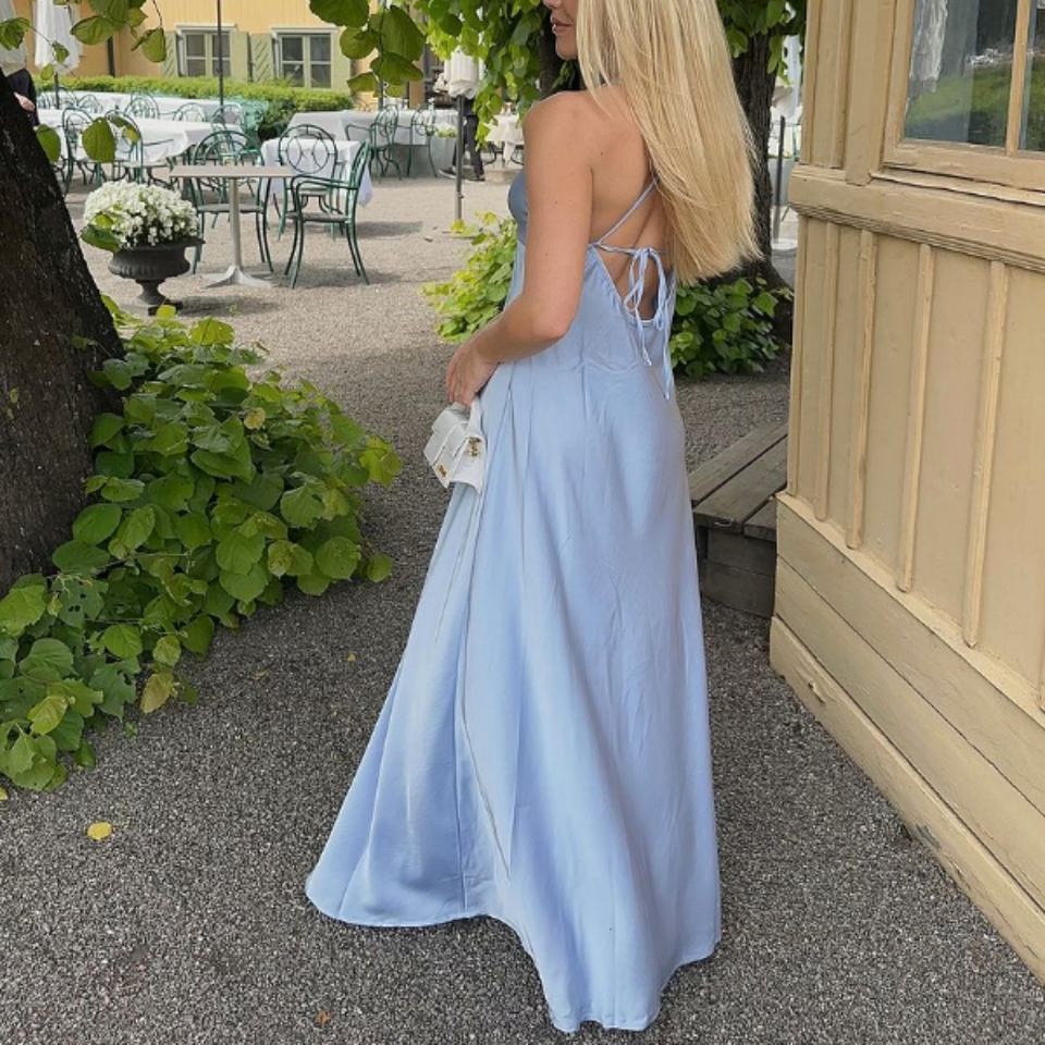 เดรสยาวลำลองแบบใหม่ คุณภาพสูง ผ้าซาติน สีพื้นเรียบง่าย สายเดี่ยว สำหรับงานปาร์ตี้