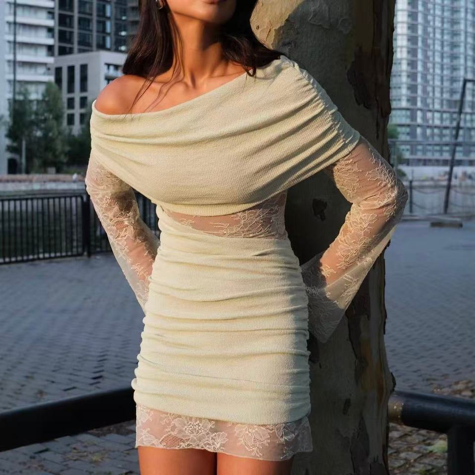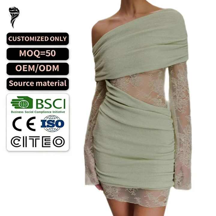 เดรสชีฟองสั้นแต่งลูกไม้แบบใหม่ล่าสุด เดรสลำลองแบบไหล่เดียวสำหรับผู้หญิง เดรสสั้นแขนยาวลูกไม้เซ็กซี่