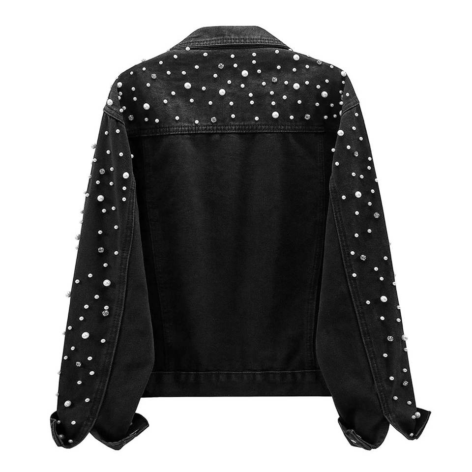 เสื้อแจ็กเก็ตกางเกงยีนส์ประดับพลอยเทียมทรงสลิมฟิตสไตล์สตรีท