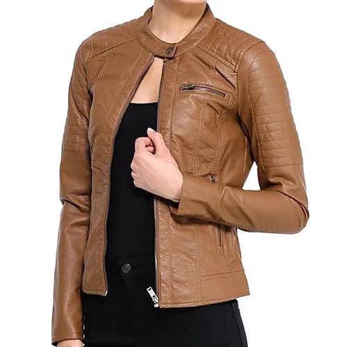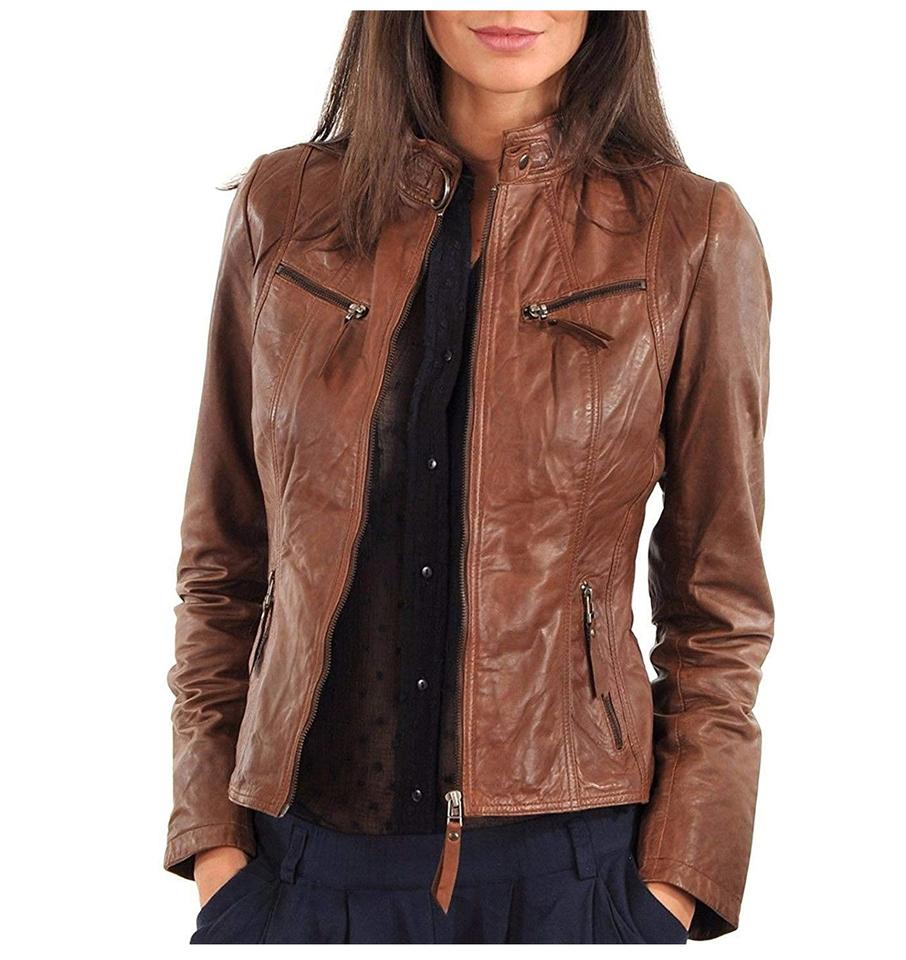 แจ็กเก็ตหนัง PU สำหรับผู้หญิงสีน้ำตาลชุดออกกำลังกายสำหรับฤดูหนาว