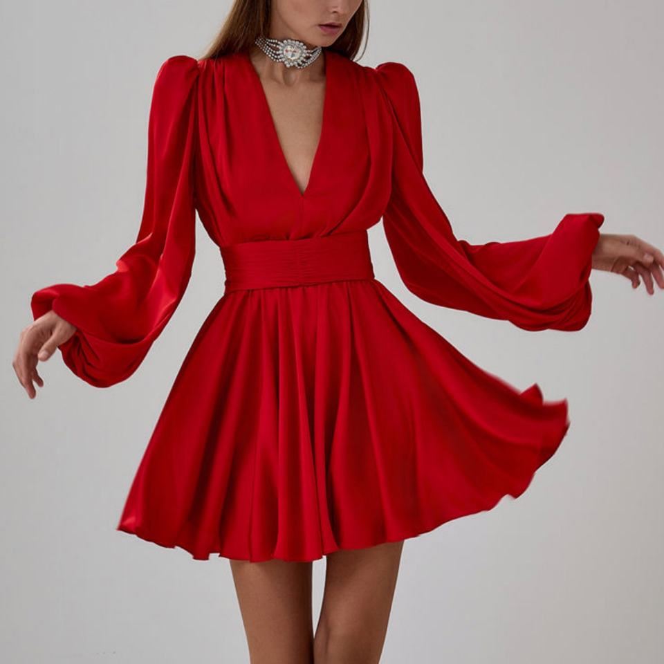 เดรสใหม่มาแรง สไตล์ OOTD สำหรับฤดูใบไม้ร่วง ชุดเดรสเซ็กซี่ คอลึก แขนยาว ผ้าฝ้าย 100% สไตล์วินเทจ ความยาวปานกลาง สำหรับผู้หญิง