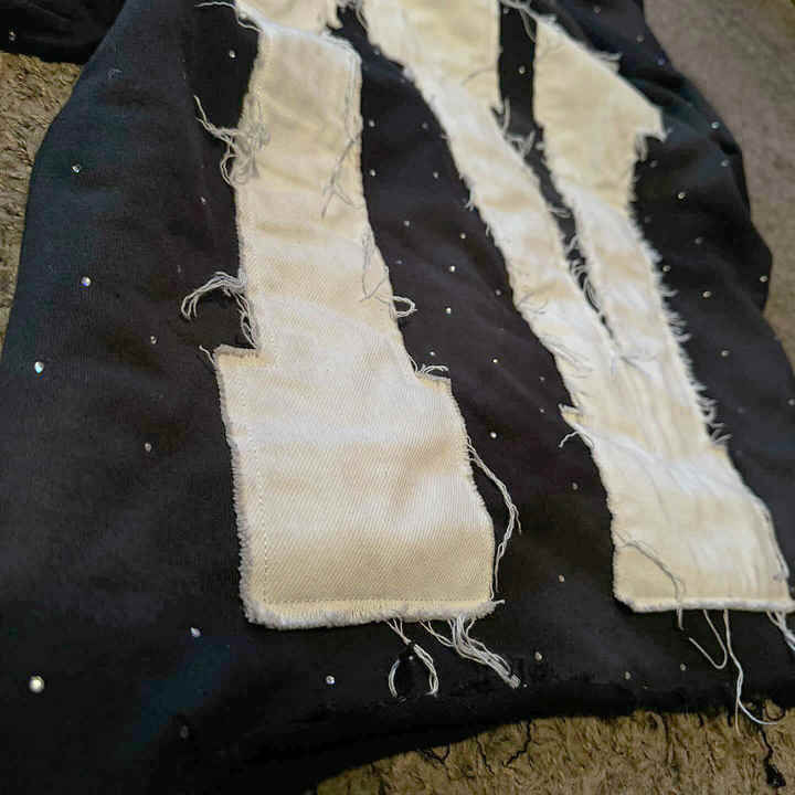 เสื้อฮู้ดดี้ครอปทรงโอเวอร์ไซส์ ผ้าคอตตอนผสม 100% ปักลายแบบดิสเทรส แต่งลายปะแบบสั่งทำ สีซีดแบบโดนแดด ที่กระเป๋า