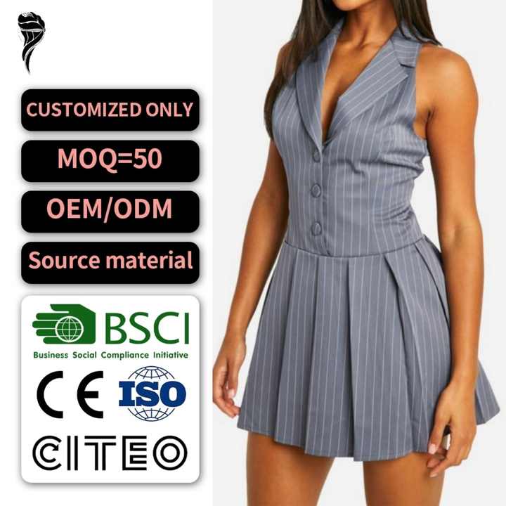 เดรสมินิเดรสคล้องคอลายทางสำหรับผู้หญิงเดรสสั้นแขนกุดมีกระดุมด้านหน้ามีจีบ