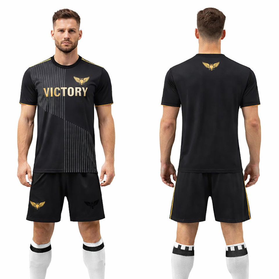 ชุดฟุตบอลสีดำทองแบบกำหนดเองสำหรับผู้ชาย ระบายอากาศได้ดี แห้งเร็ว ชุดกีฬา ชุดฝึกซ้อม แบบซับลิเมชั่น รับผลิตตามแบบ (OEM) ขายส่ง