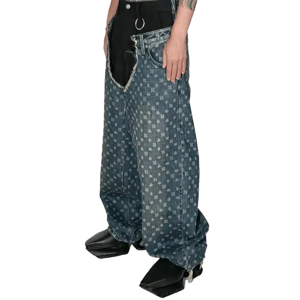 กางเกงยีนส์ผู้ชายทรงหลวมขาบานเอวสองชั้นพิมพ์ลายเลเซอร์ดีไซน์เนอร์ Y2K สไตล์ลำลองแฟชั่นสบายๆ รับสกรีนโลโก้ตามสั่ง รุ่นใหม่ล่าสุด