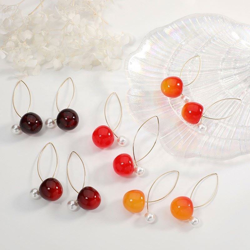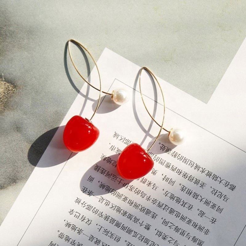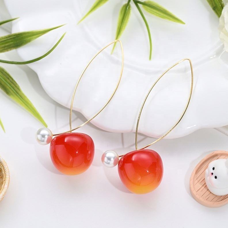 ต่างหูแฟชั่นทรงเรขาคณิตแบบห้อยประดับเพชรและเชอร์รี่สีแดง ดีไซน์น่ารักหวานแหวว วัสดุโลหะผสมสังกะสีชุบทอง สำหรับผู้หญิง สินค้ามาใหม่