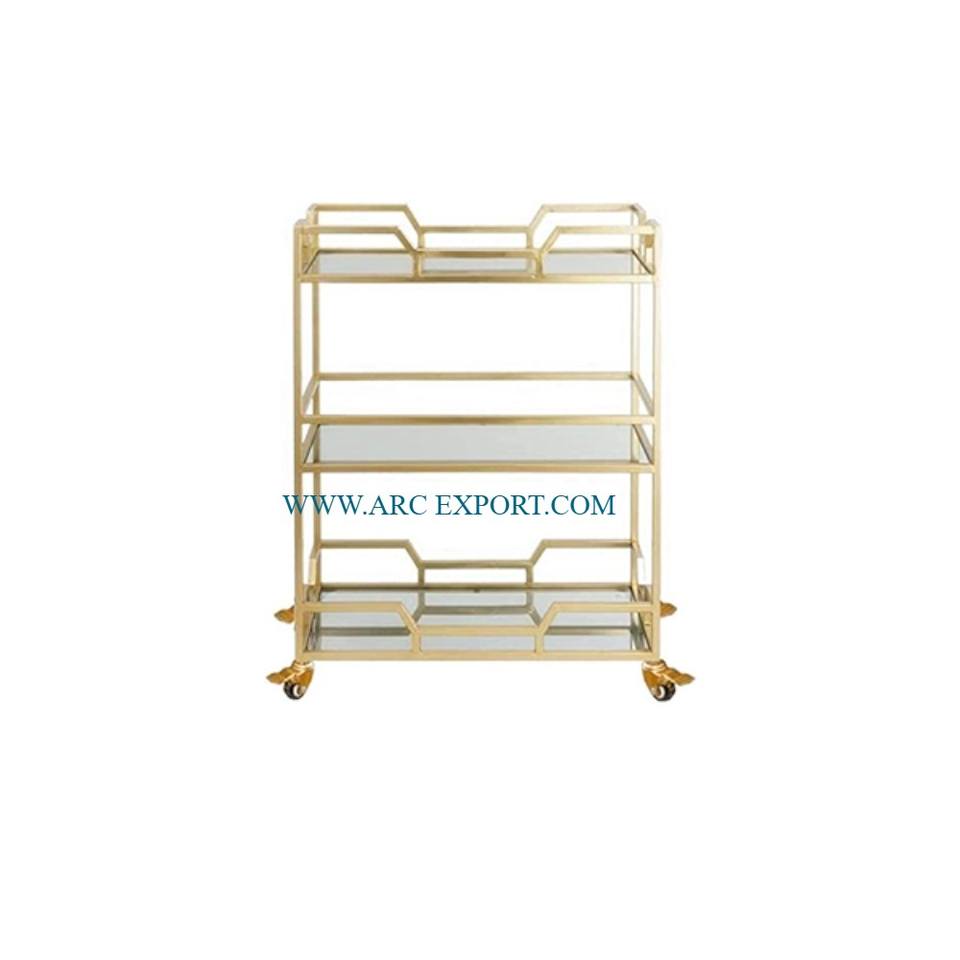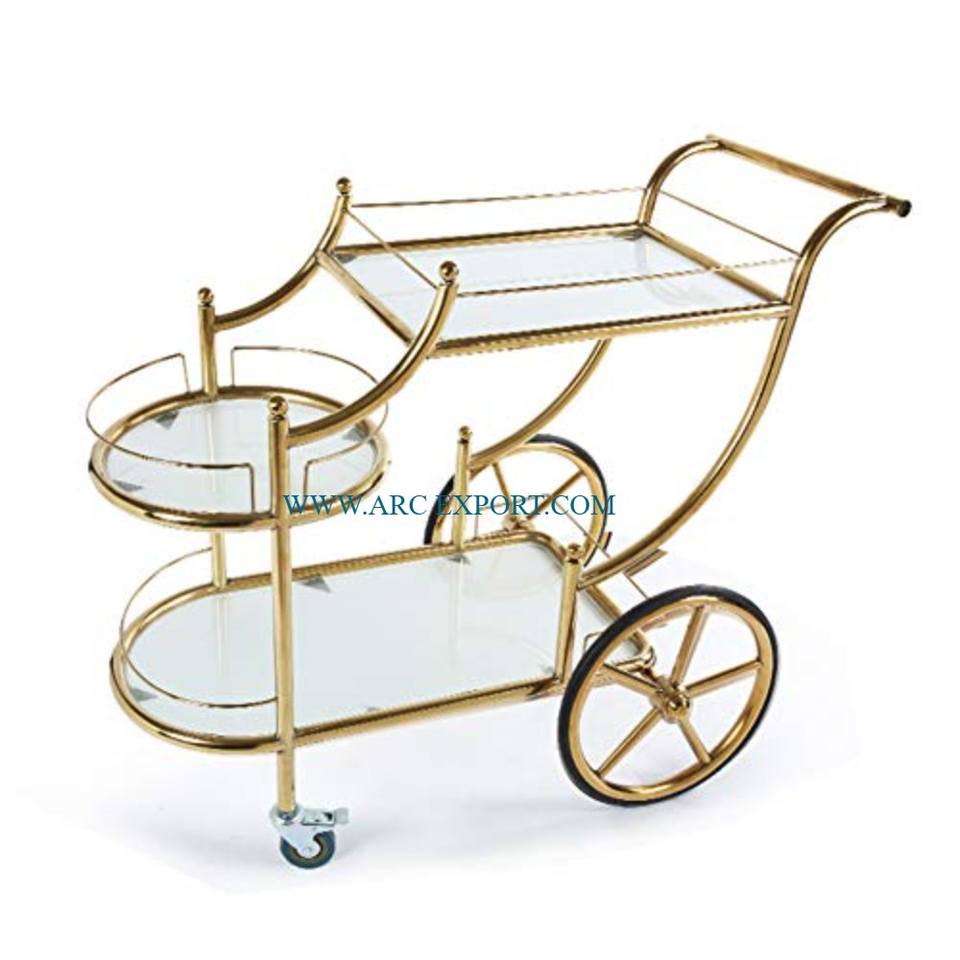 รถเข็น2ชั้นพร้อมกรอบโลหะและแก้วสำหรับตกแต่งใหม่รถเข็นเฟอร์นิเจอร์โรงแรมทำจากโลหะสีทอง