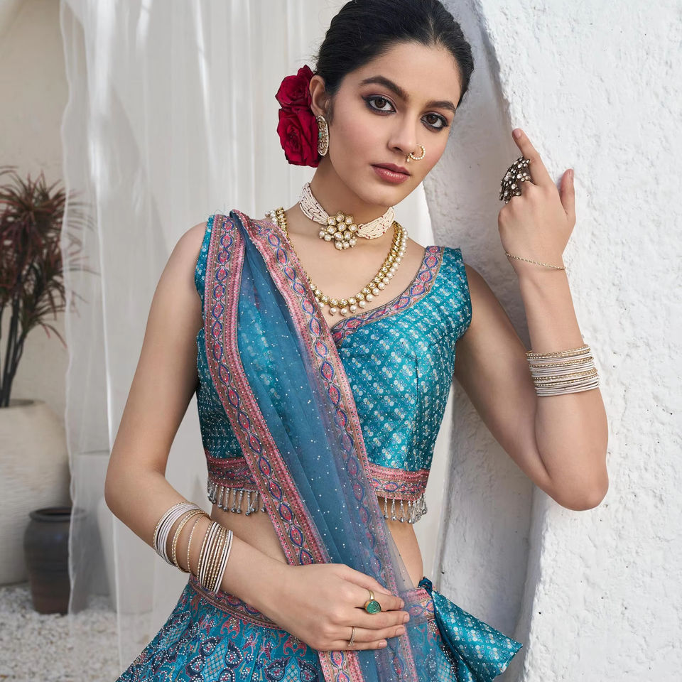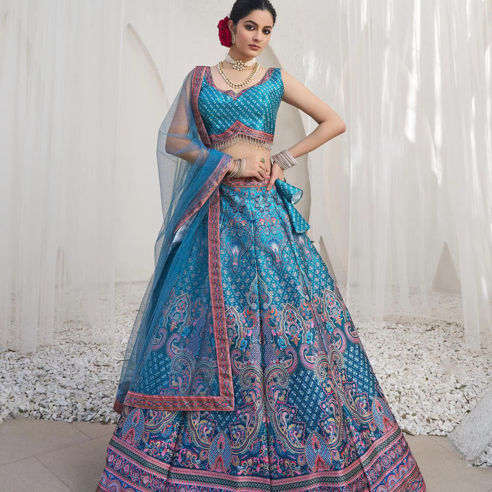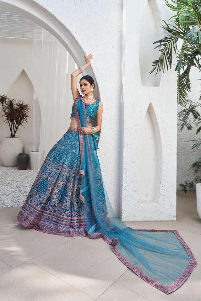 ชุดเลเฮนกาโชลีดีไซน์เนอร์มาใหม่ สีฟ้าเทอร์ควอยซ์ สำหรับงานแต่งงานและงานปาร์ตี้ ดีไซน์หรูหรา พร้อมงานปักมือแบบซิรอคซี
