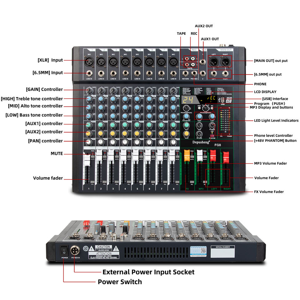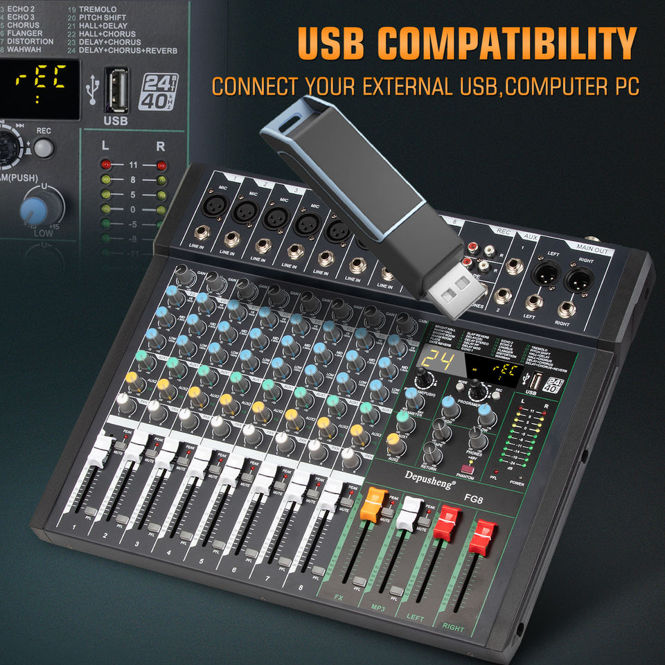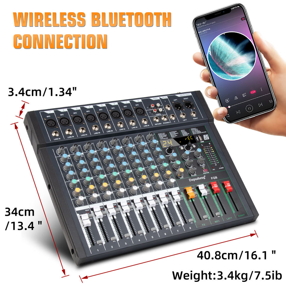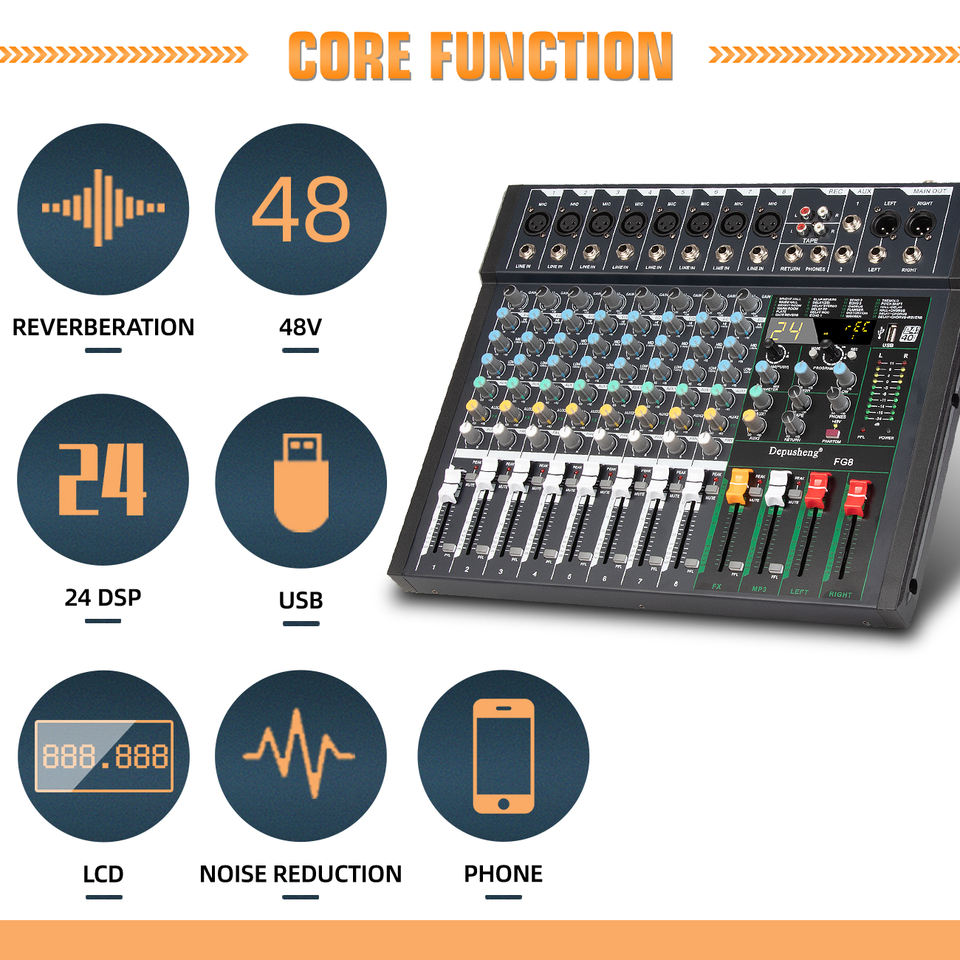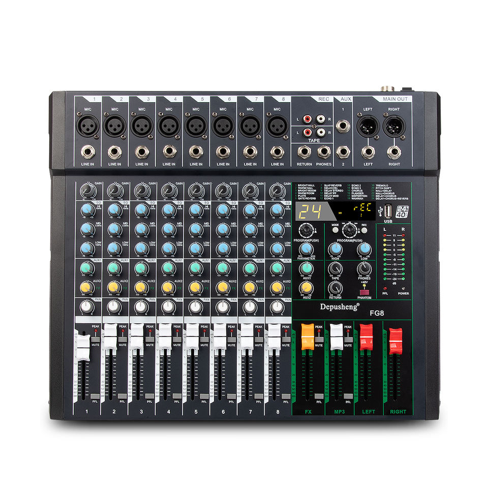 เครื่องผสมสัญญาณเสียงระดับมืออาชีพ48V Phantom Power 8ช่องสัญญาณสำหรับการแสดงบนเวที FG8สินค้ามาใหม่
