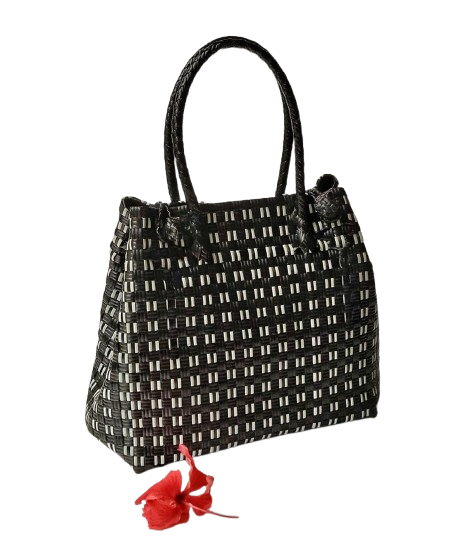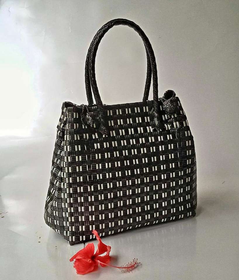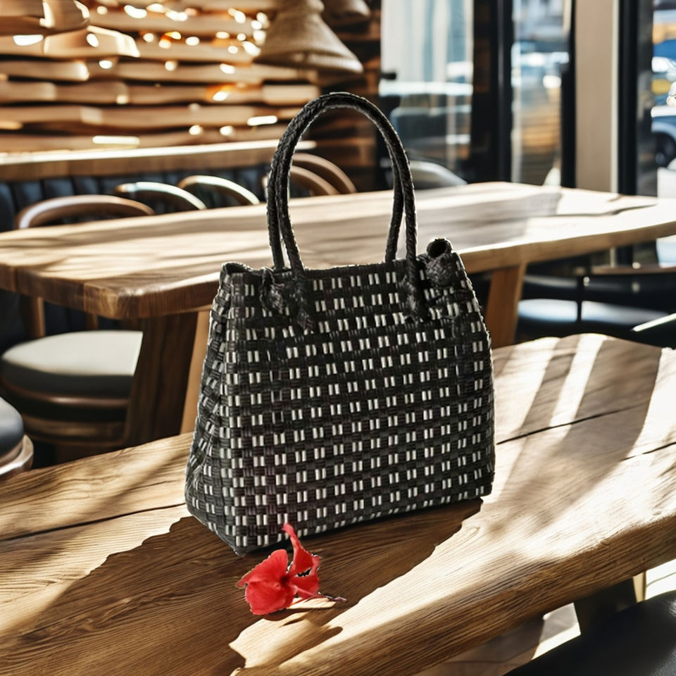 กระเป๋าสะพายไหล่สำหรับผู้หญิงกระเป๋าสะพายไหล่ผ้าทอพลาสติกสีดำรีไซเคิลดีไซน์หรูหราออกแบบได้ตามต้องการ