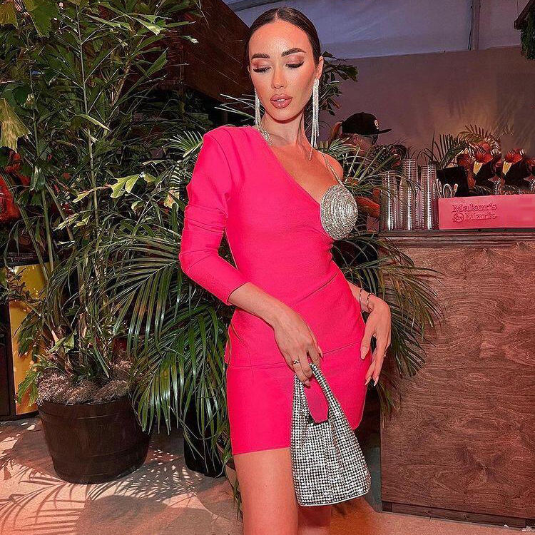 ชุดเดรสสั้นแฟชั่นแขนยาวเปิดไหล่ข้างเดียวสำหรับผู้หญิงชุดเดรสแบนเดจสำหรับปาร์ตี้งานเลี้ยงออกเดททุกวัน