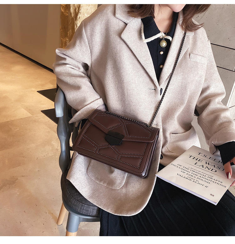 กระเป๋าสะพายพาดลำตัวหนังนิ่มแฟชั่นมาใหม่สำหรับผู้หญิงกระเป๋าสะพายไหล่ทรงสี่เหลี่ยมเล็กหรูหรามีหมุดย้ำสายโซ่