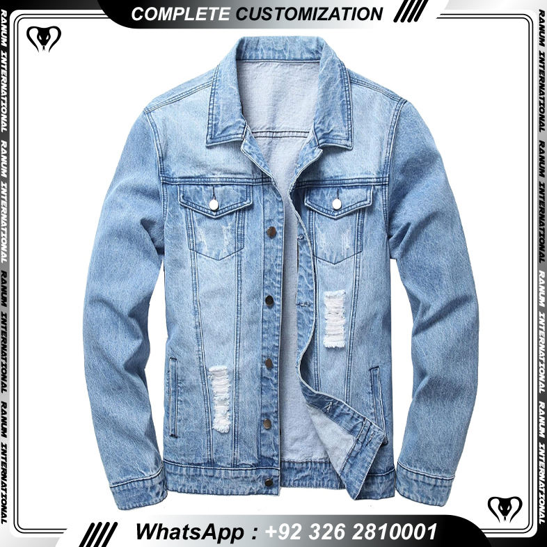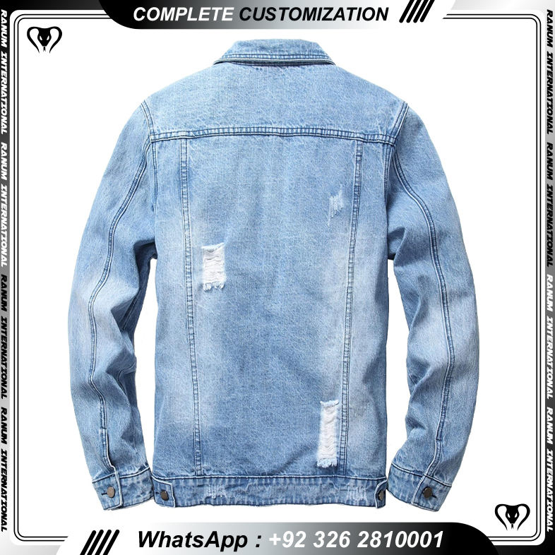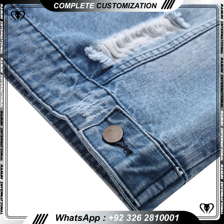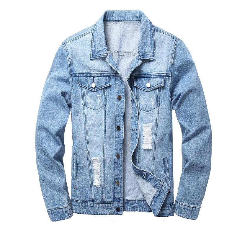 แจ็กเก็ตยีนส์สไตล์สตรีทแวร์สำหรับผู้ชายแจ็กเก็ตยีนส์มีกระดุมขาดด้านหน้า