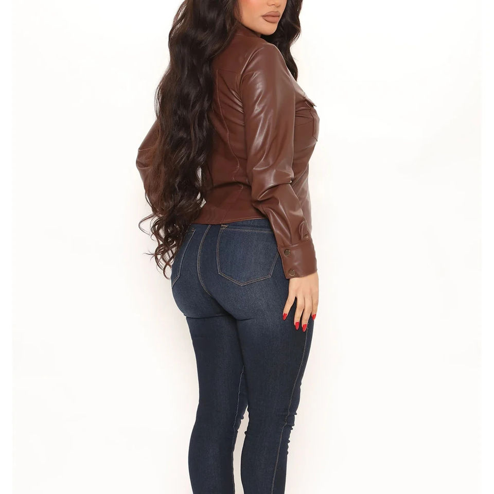 เสื้อหนัง PU แขนยาวสำหรับผู้หญิง, เสื้อใส่สบายสำหรับใส่ไปสำนักงานหรือใส่สบายสไตล์แฟชั่นแนวสตรีทสีน้ำตาล