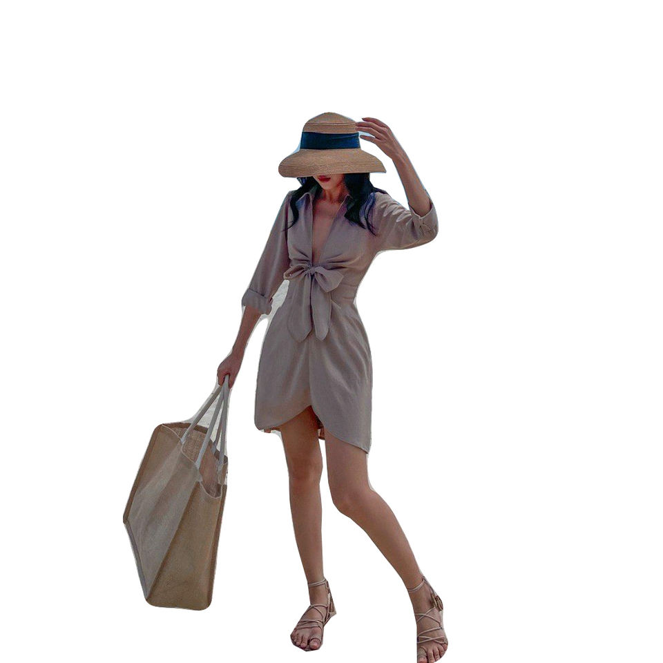 ชุดเดรสคอวีมีโบว์ยาวคลุมเข่าเซ็กซี่สำหรับผู้หญิงเสื้อผ้าลำลองแฟชั่นฤดูร้อนผลิตจากผ้าชีฟองเวียดนาม
