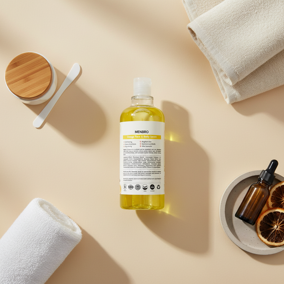 เซรั่มบำรุงผิวหน้าและผิวกาย สูตรใหม่ ฟรีออกแบบโลโก้ ผลลัพธ์เร็ว สารสกัดจากธรรมชาติสีส้ม วิตามินอี ช่วยกระชับรูขุมขน AHA ช่วยให้ผิวขาวกระจ่างใส