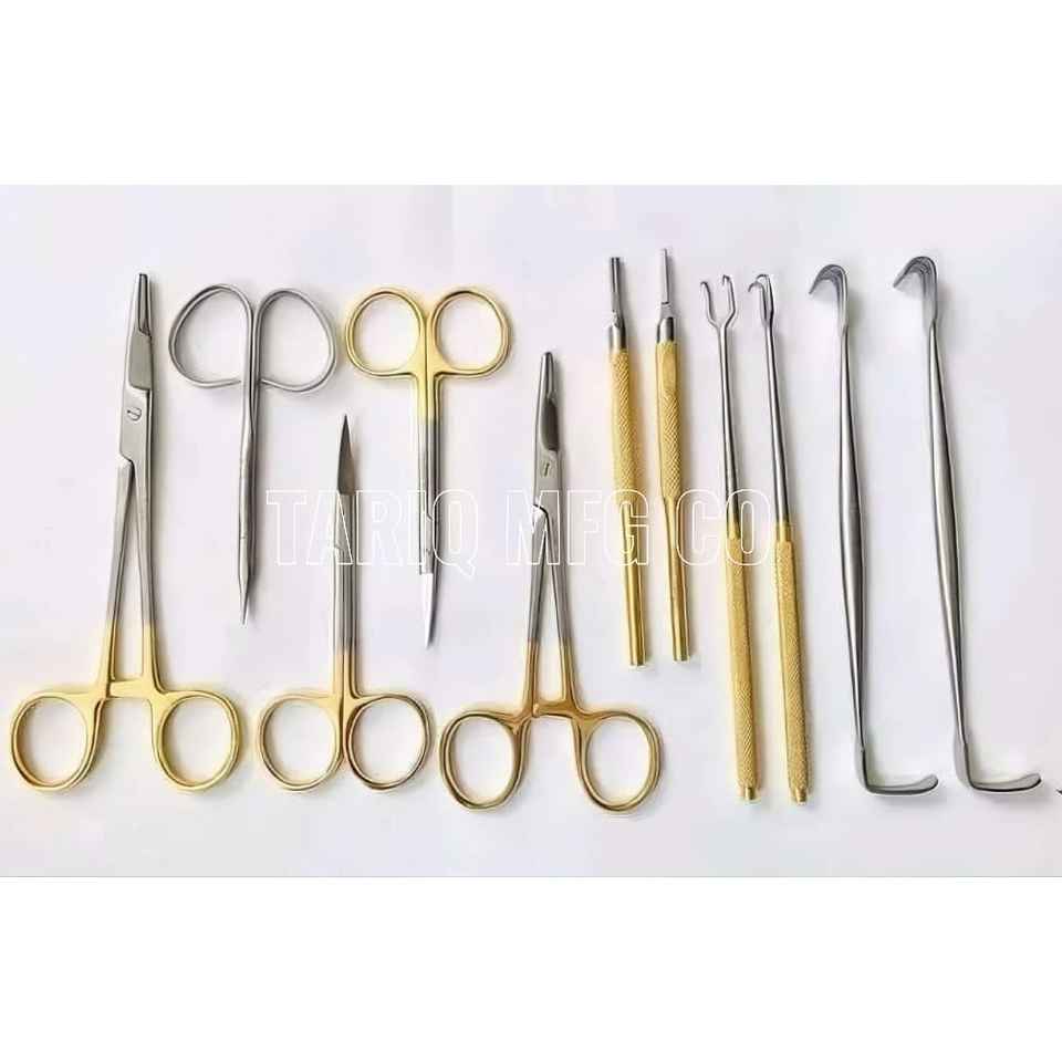 ชุดเครื่องมือผ่าตัดเล็กแบบใช้มือ รุ่นใหม่ล่าสุด ทำจากเหล็กชุบทอง ประกอบด้วยที่จับเข็ม, กรรไกรเมทเซนบัม, กรรไกรตัดผ้าพันแผล, ด้ามมีดผ่าตัด