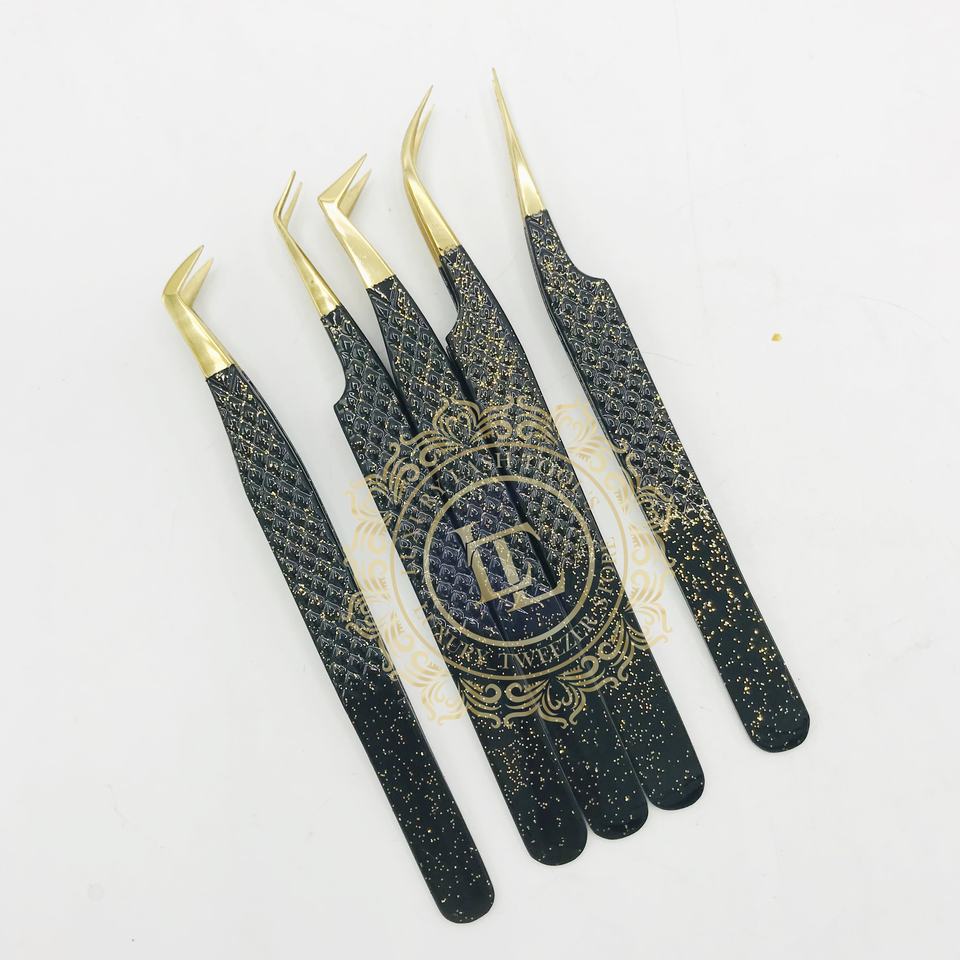แหนบขนตาสแตนเลสที่ผ่านการทดสอบด้วยมือพร้อมโลโก้ส่วนตัวปลายทองและผงเคลือบกลิตเตอร์สีดำ