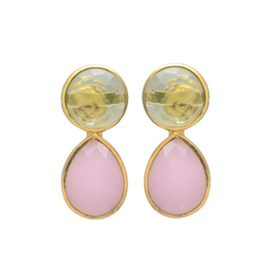 มาใหม่ต่างหูสตั๊ดกลมชุบทองประดับหินสีควอทซ์สีชมพูและสีควอตซ์กลมกลืนเปล่งปลั่ง