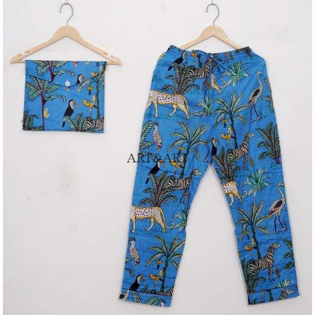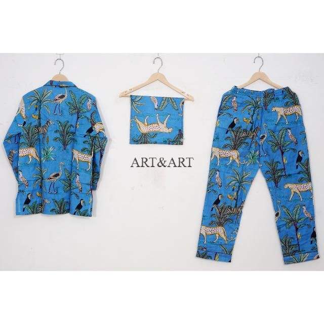 ชุดนอนผ้าฝ้ายพิมพ์ลายป่าสำหรับผู้หญิงแบบใหม่ ทำมือ 100% แห้งเร็ว ระบายอากาศได้ดี ชุดนอน 3 ชิ้น