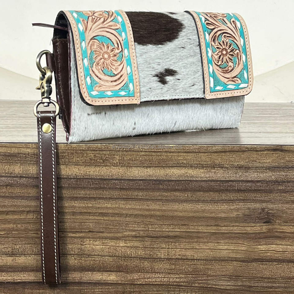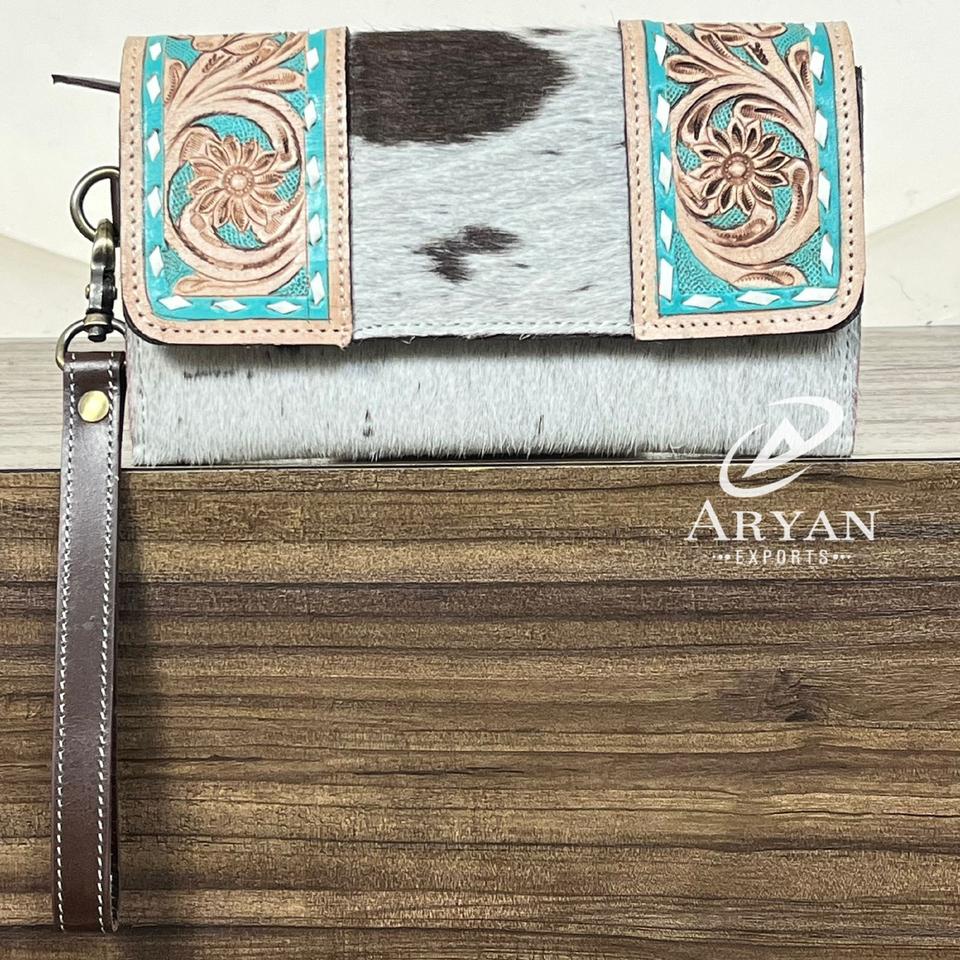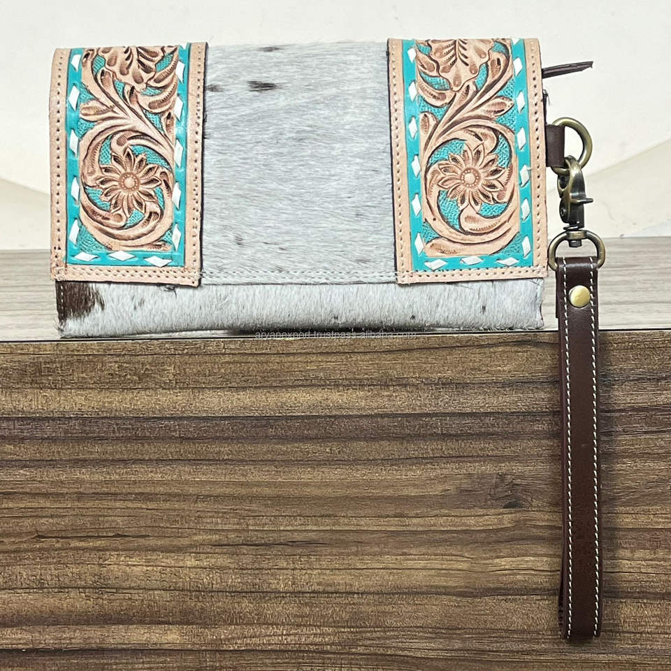 Western Hand Tooled Cowhide Leather Wallet Clutch