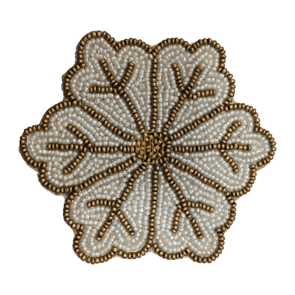 ที่รองชาทรงกลมลูกปัดสีขาวมุกหรูหราดีไซน์ดอกไม้สีทองทำด้วยมือเป็นมิตรต่อสิ่งแวดล้อมสำหรับตกแต่งโต๊ะที่หรูหรา