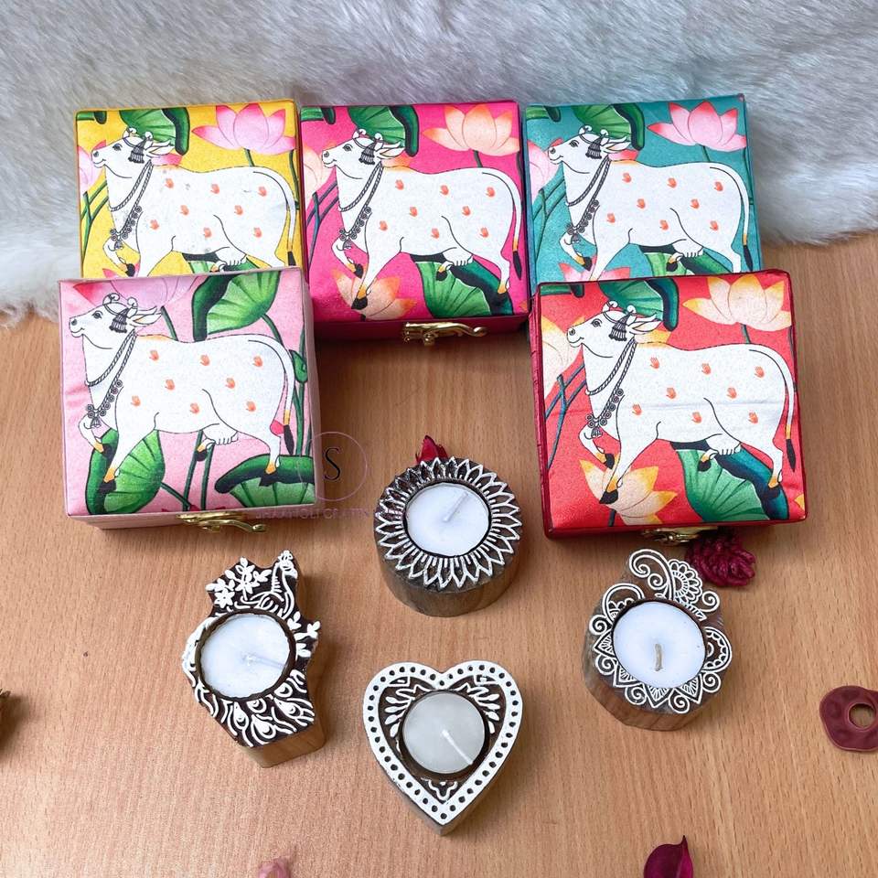 Product Name:Wooden Tea-Light Holder With Pichwai cow printed Fabric Big Cash Box