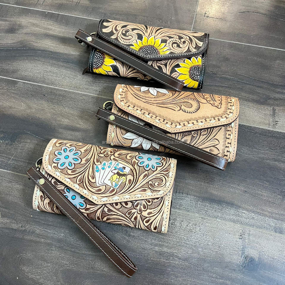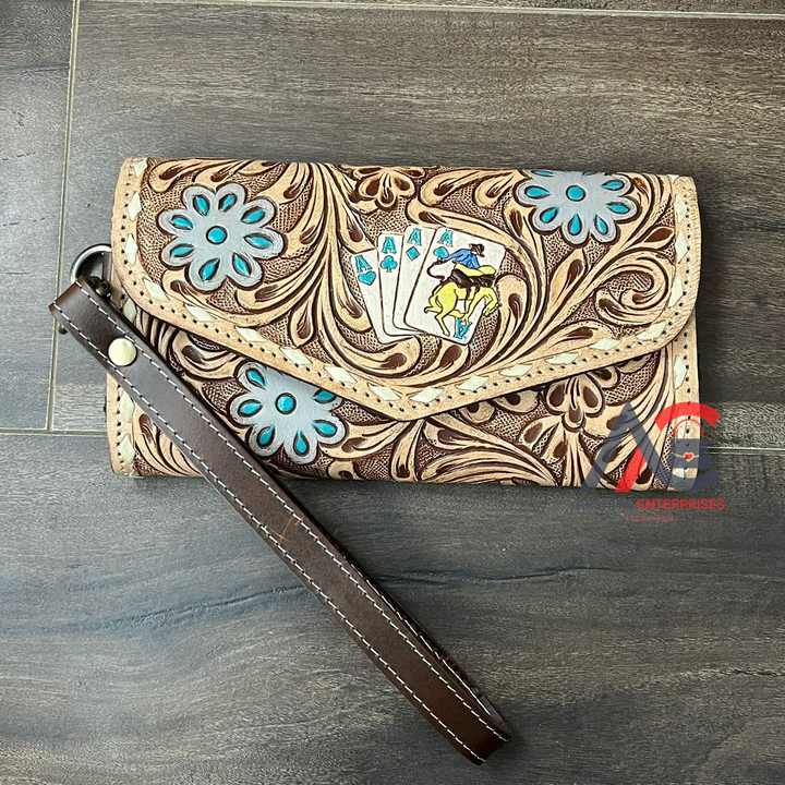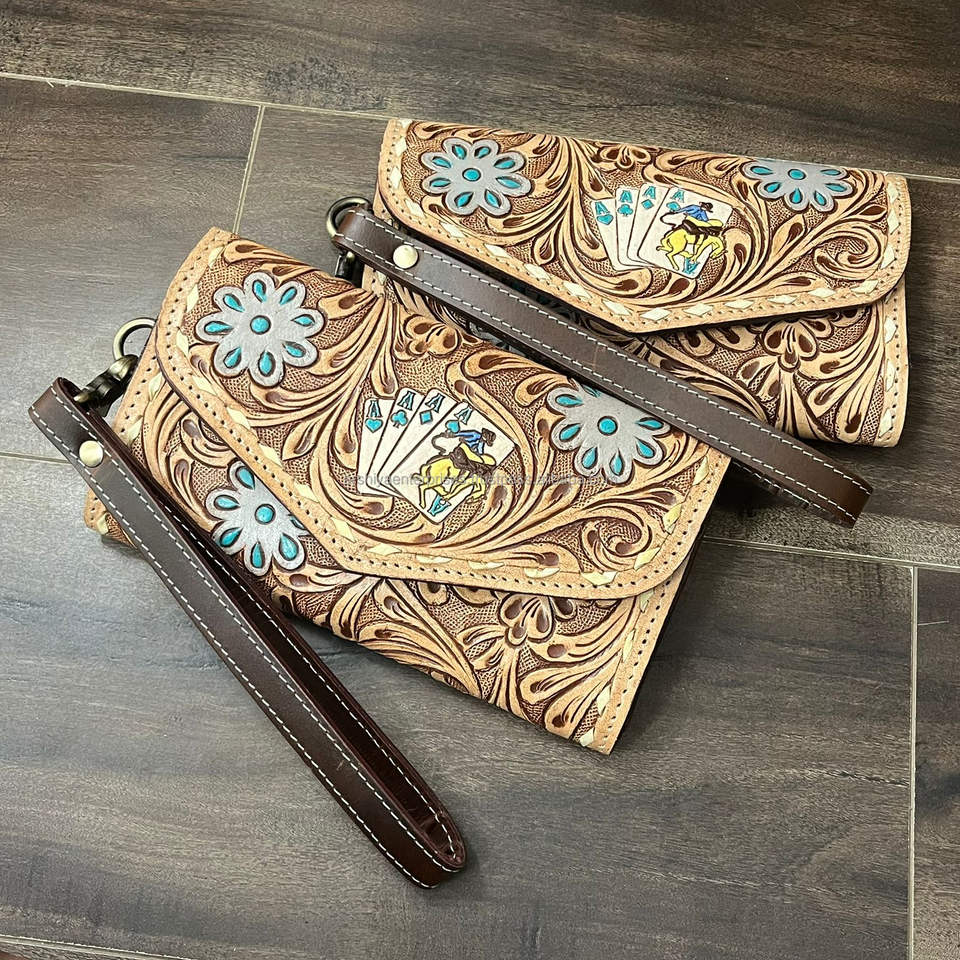 Hand Tooled Leather Cowboy & Card Design Wristlet Wallet
