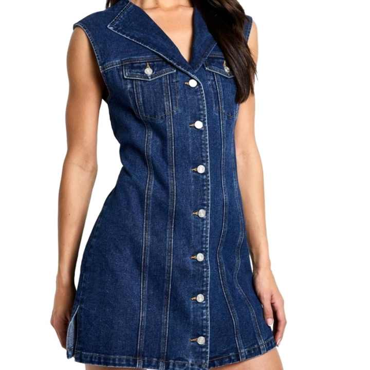 เดรสยีนส์แขนกุดคุณภาพสูงสำหรับผู้หญิงมาใหม่ ดีไซน์กระดุมผ่าหน้า ทรงเข้ารูป มินิเดรสสำหรับฤดูร้อน