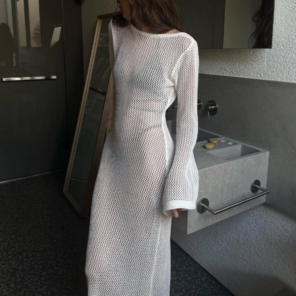 เดรสไหมพรมถักโครเชต์แขนยาวเปิดหลัง ดีไซน์เซ็กซี่ ผ้าฝ้าย 100% คุณภาพสูงสำหรับผู้หญิง ชุดเดรสชายหาดฤดูร้อนแบบใหม่