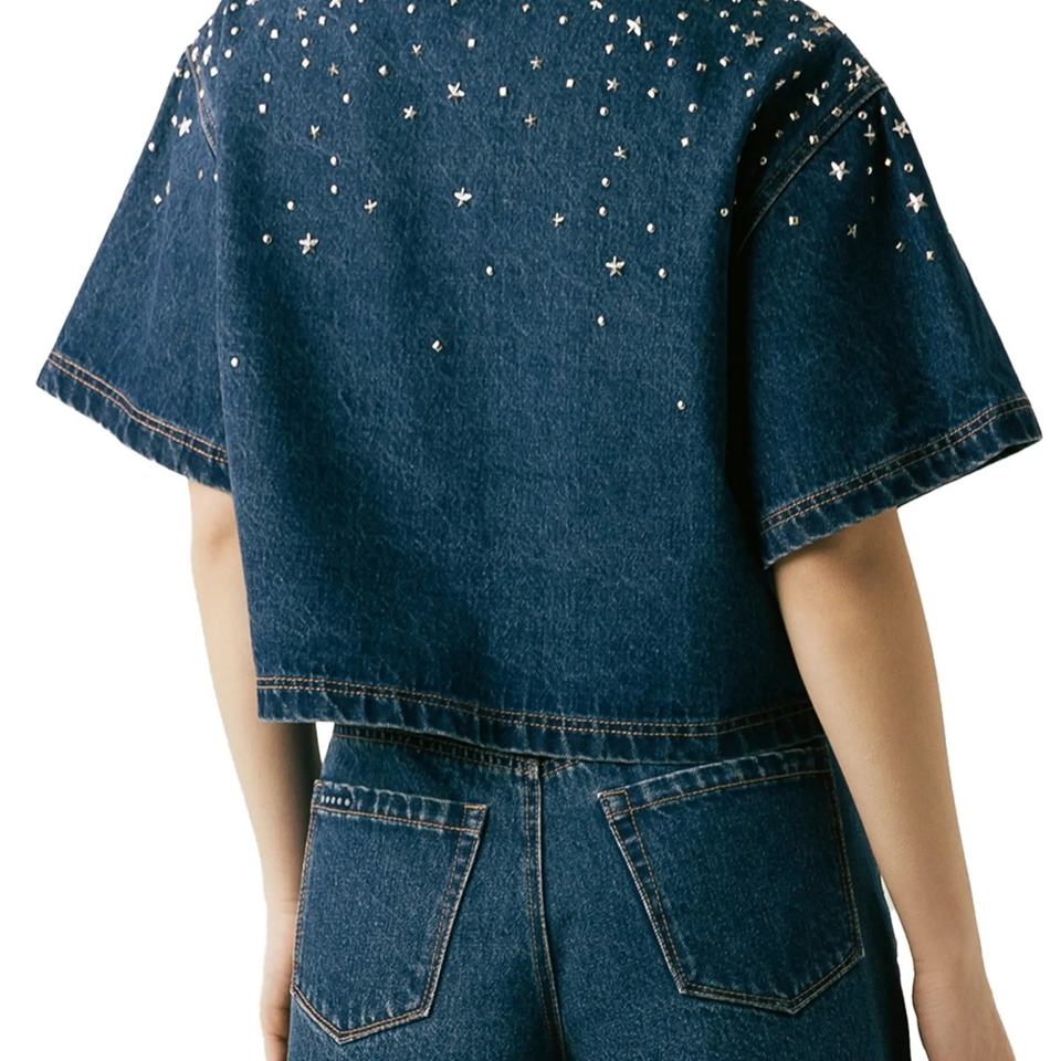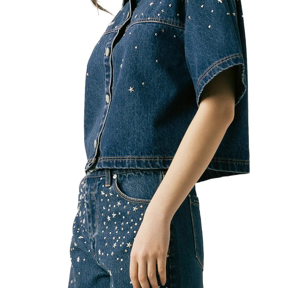เสื้อเชิ้ตเดนิมติดกระดุมคุณภาพสูงสำหรับผู้หญิง รุ่นใหม่ล่าสุด ประดับคริสตัล พร้อมกางเกงขาสั้นทรงเอประดับคริสตัล ลุคซัทช์สีซีดแบบวินเทจ