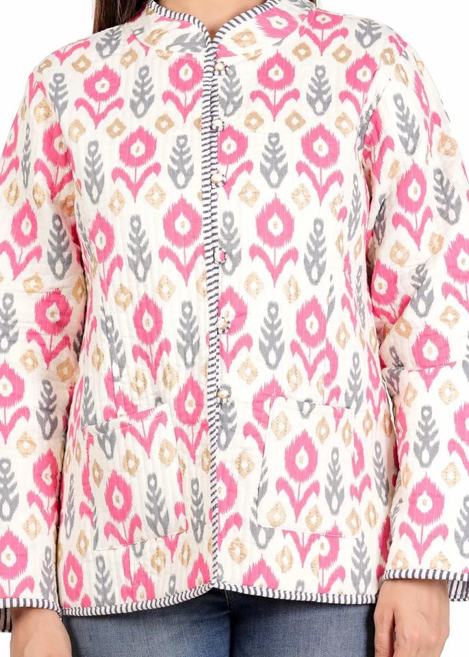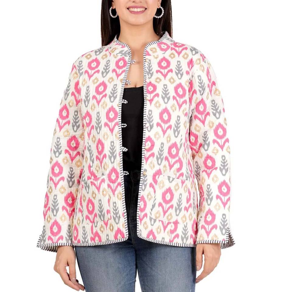 เสื้อแจ็คเก็ตผ้าควิลท์พิมพ์ลายบล็อกสไตล์โบฮีเมียนอินเดียสำหรับฤดูใบไม้ร่วง/ฤดูหนาว งานแฮนด์เมดจากผ้าฝ้าย แบบสองด้าน ลายดอกไม้ทอ ผ้าแคมบริก