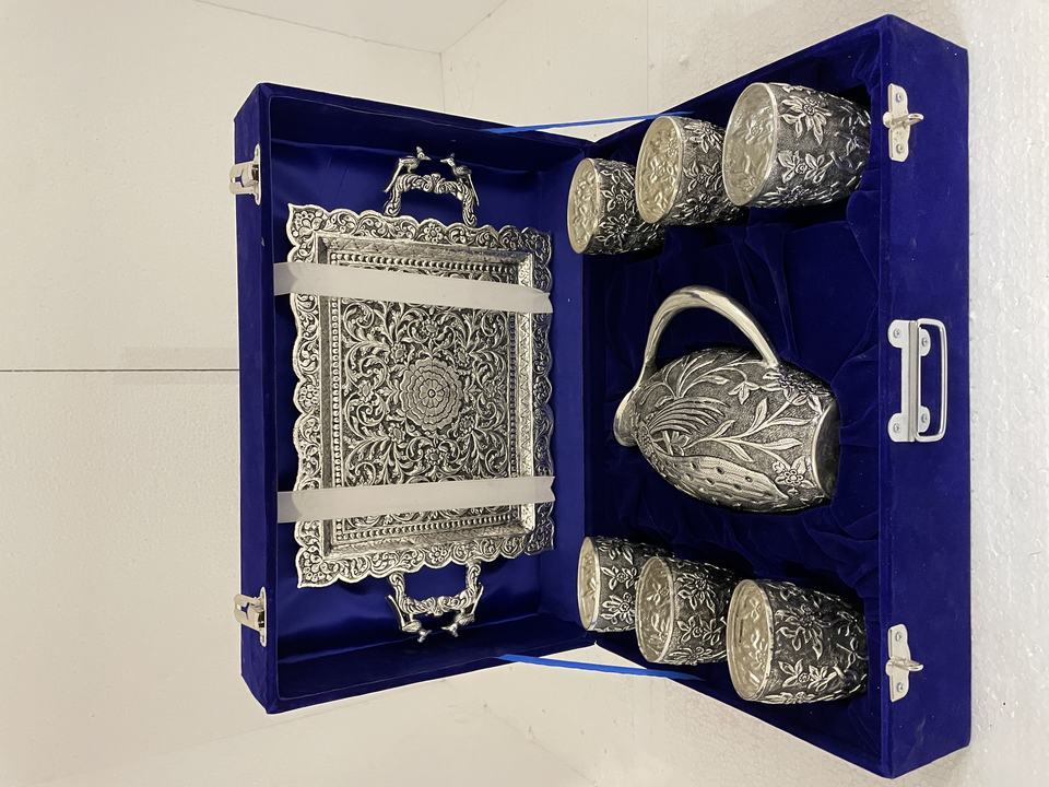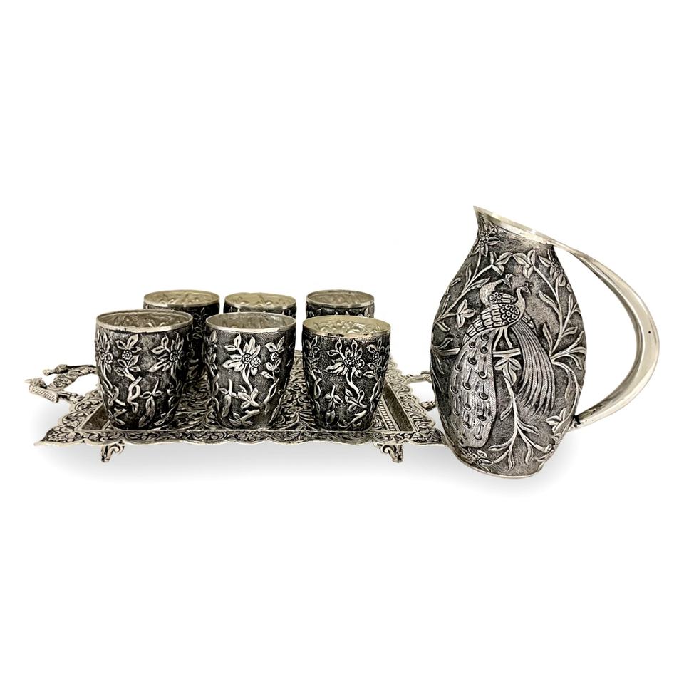 ชุดเหยือกชุบเงินแฮนด์เมดสไตล์อินเดีย,พร้อมแก้ว6ใบและถาด1ใบสำหรับให้ของขวัญและของตกแต่งบ้าน
