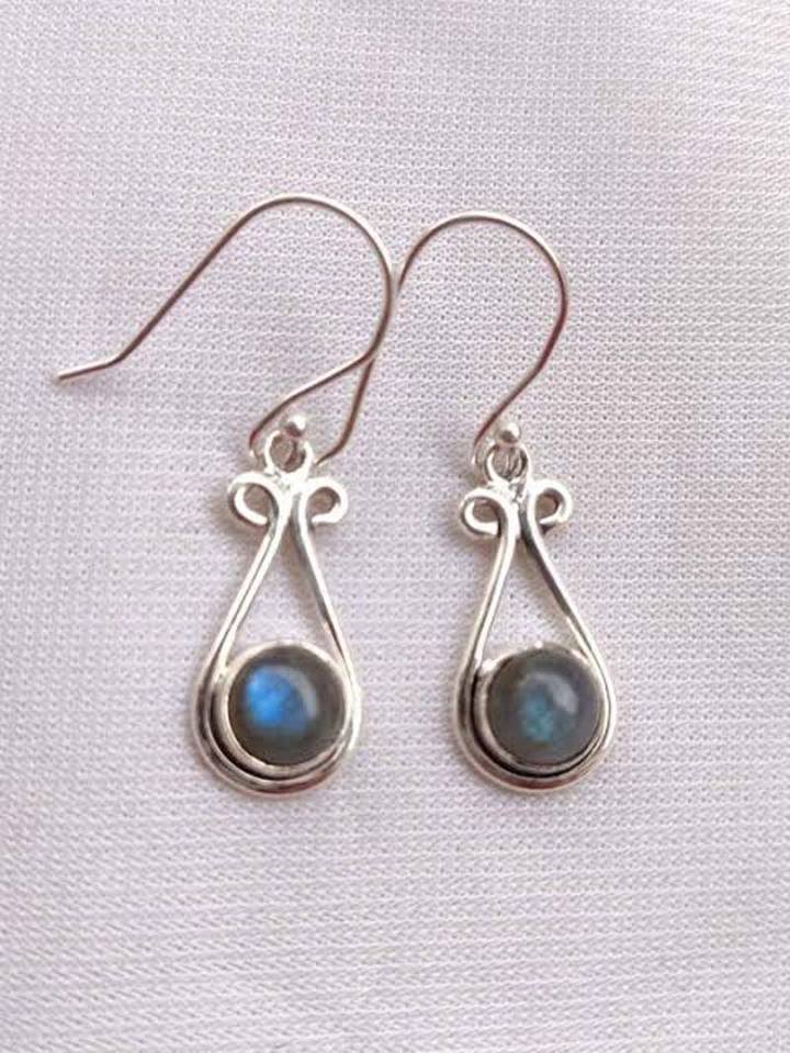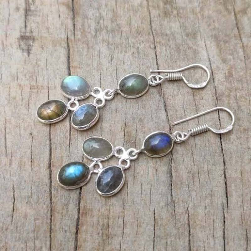 ต่างหูห้อยประดับพลอยควอตซ์สีน้ำเงินลาบราดรอยต์ ชุบเงิน ดีไซน์วินเทจ ทรงกรอบ สำหรับทุกเพศ ได้รับการรับรองจาก IGI พร้อมสัญลักษณ์พระพุทธศาสนา ฮารี โอม