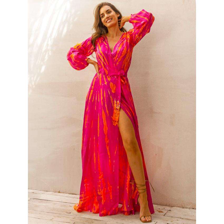 ชุดว่ายน้ำลำลองสำหรับผู้หญิง ดีไซน์ใหม่ ลายมัดย้อม ผ้าโมดอล คอวี แขนยาว ยาวคลุมเท้า คุณภาพสูง ผลิตตามสั่ง สำหรับฤดูร้อน