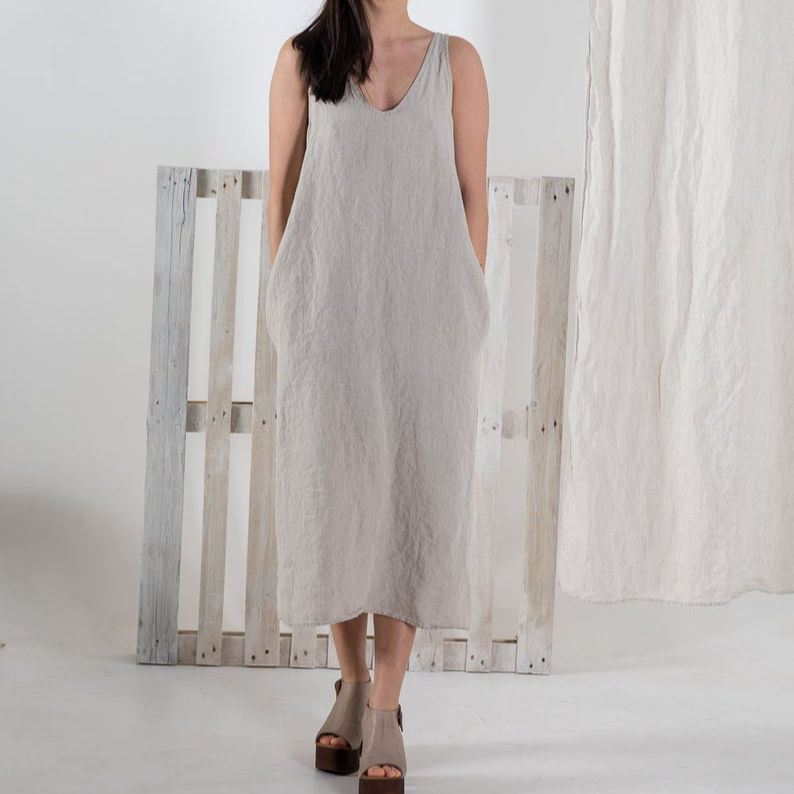 เดรสผ้าเครปสีดำ ดีไซน์ใหม่ล่าสุด คอเหลี่ยม แขนกุด ยาวคลุมเท้า ผ้าลินินสำหรับผู้หญิง ทอแบบธรรมชาติ ติดกระดุม